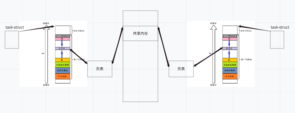共享内存通信简单来说,就是让多个进程看到同一个内存块。当进程被创建,可以认为天然的就具备了虚拟地址空间,虚拟地址与物理地址的一一对应需要借助页表的帮助。当进程申请一块共享内存,在该进程的共享区就会划出与该共享内存大小相等的地址空间,同样的,需要页表来记录映射关系。当另一个进程也通过页表建立与该共享内存的映射关系后,两个进程就能在自己的虚拟地址空间对同一块共享内存进行访问,当两个进程看到了同一份资源,也就认为实现了进程通信。
